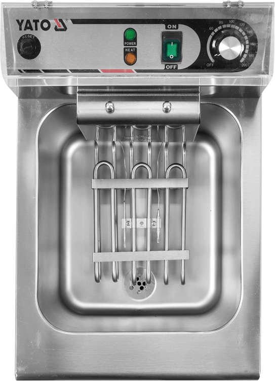 Frytownica YATO posiada bardzo wytrzymały kosz o wymiarze 240x220x115mm, któ,ry posiada plastikową, nienagrzewającą się rękojeść. Natomiast specjalne zaczepy umożliwiają powieszenie kosza bezpośrednio nad zbiornikiem, minimalizując ryzyko zachlapania olejem blatu roboczego. Dzięki temu znacznie zwiększa się czystość stanowiska pracy i minimalizuje czas potrzebny na czyszczenie.