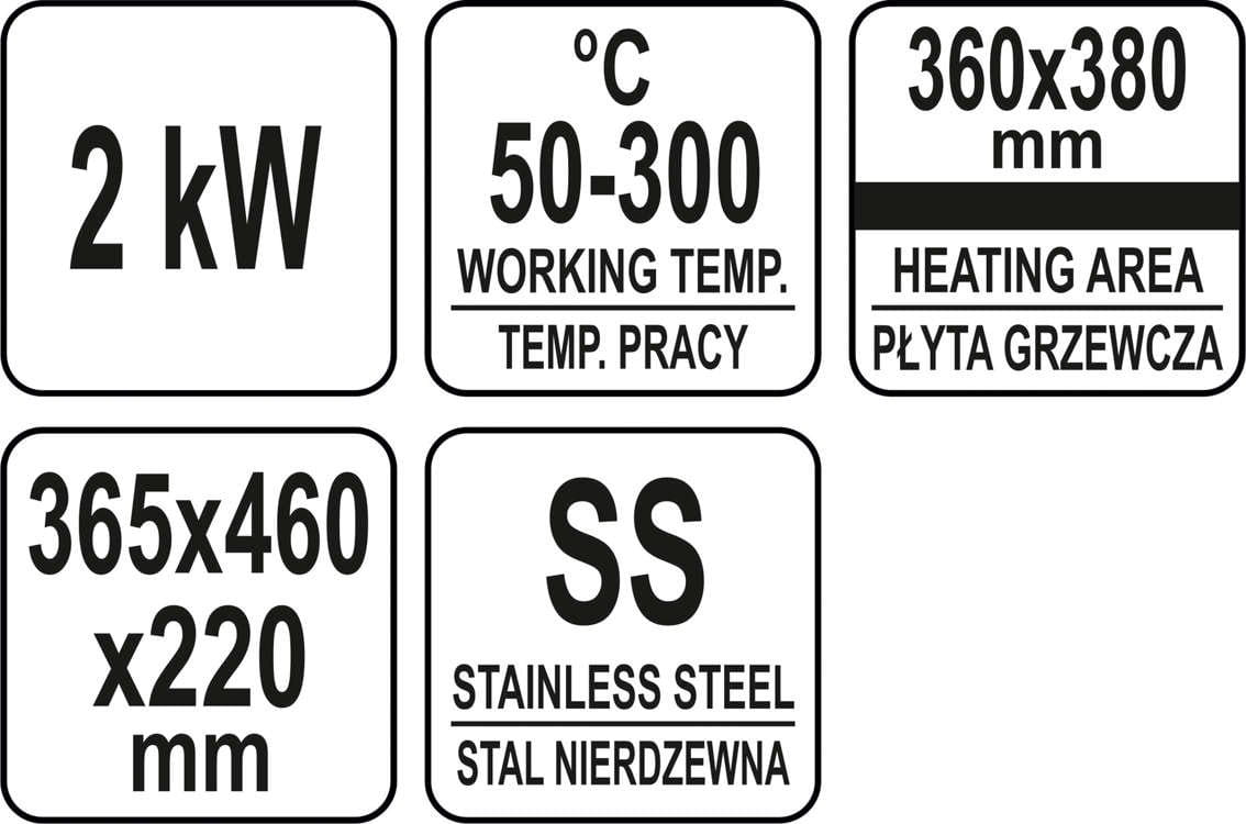 Grzałka o mocy 2,0kW posiada sterowanie za pomocą potencjometru z regulacją temperatury pracy w zakresie 50~300º,C, któ,ry umieszczony jest na panelu frontowym. Natomiast z tyłu urządzenia umieszczony jest bryzgoszczelny wyłącznik, któ,ry umożliwia wyłączenie grilla, bez konieczności odłączania przewodu zasilającego z sieci. Urządzenie zasilane jest prądem 230V~50Hz. Wbudowany bezpiecznik zapobiega przed przegrzaniem się grilla.