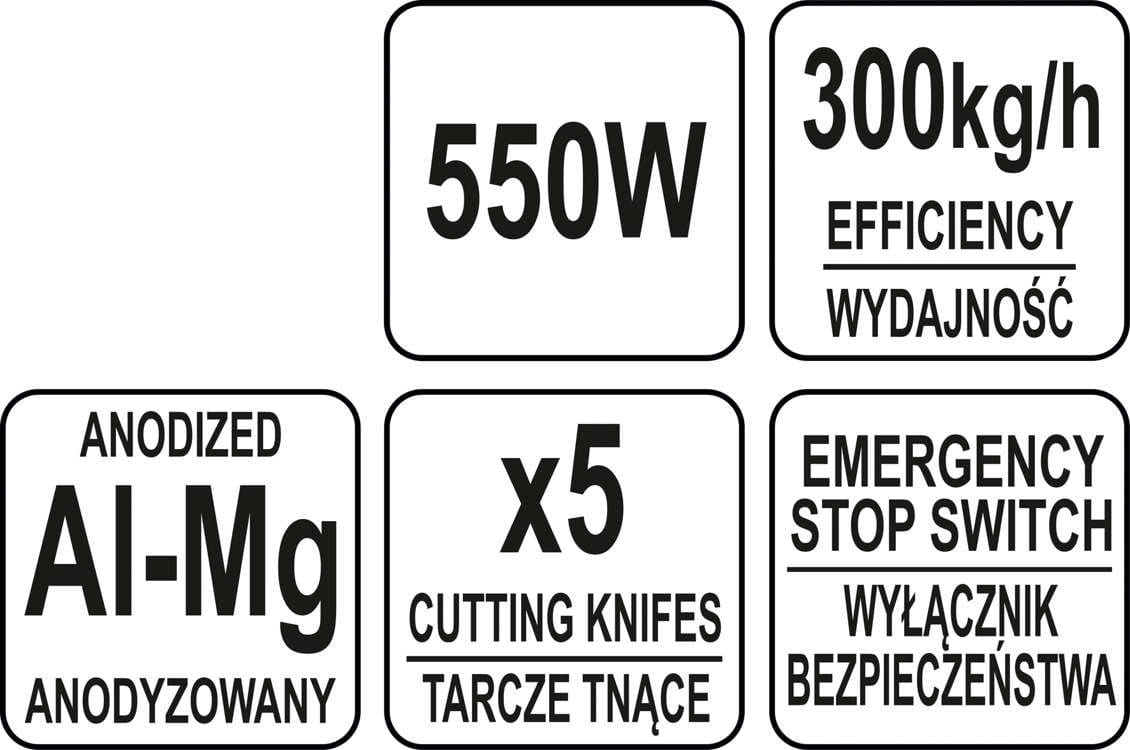 Zastosowanie silnika o mocy 550W zapewnia wysoka wydajność, sięgającą 300kg/h. Pozwala to na bardzo szybkie krojenie dużej ilości warzyw, co jest szczegó,lnie ważne dla użytkownikó,w profesjonalnych.