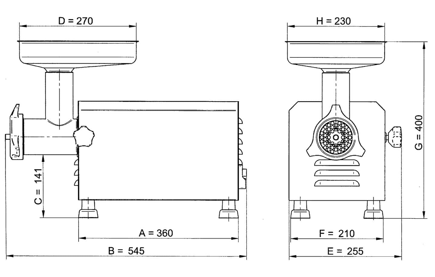Moc: 1 kWWymiary: 545 x 255 x 400 (H) mmRozstaw Nóżek: 360 x 210 mmWydajność do 200 kg/hObroty ślimaka 130 obr/minŚrednica sitka 82 mmPoziom hałasu: ≤ 75 dBZasilanie: 1 faza 230V 50HzCiężar: 26 kgOgraniczenia: Nie używać urządzenia do mielenia zmrożonego mięsa, mięsa z kością, a także do kruszenia samych kości.Konserwacja:Elementy maszyny stykające się z żywnością myć codziennie, po myciu osuszyć.Zabrania się mycia całej maszyny strumieniem wody.